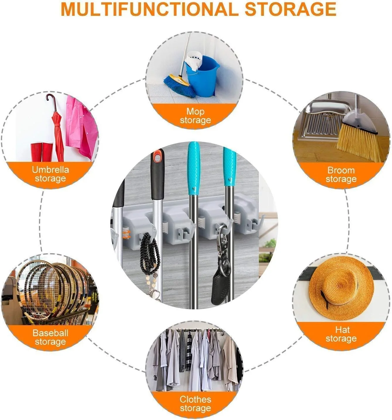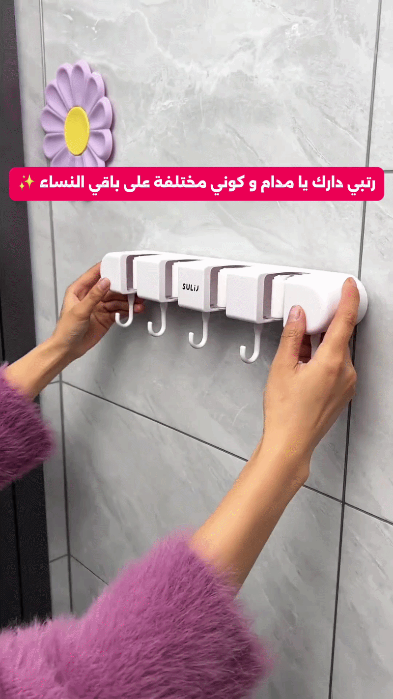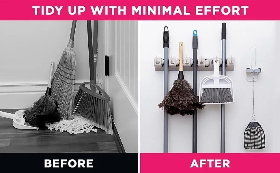 📏 استغلال احترافي للمساحة: يحتوي على 5 فتحات للمكانس و6 خطافات (Crochets) للفوط، المفاتيح، والفرش الصغيرة.